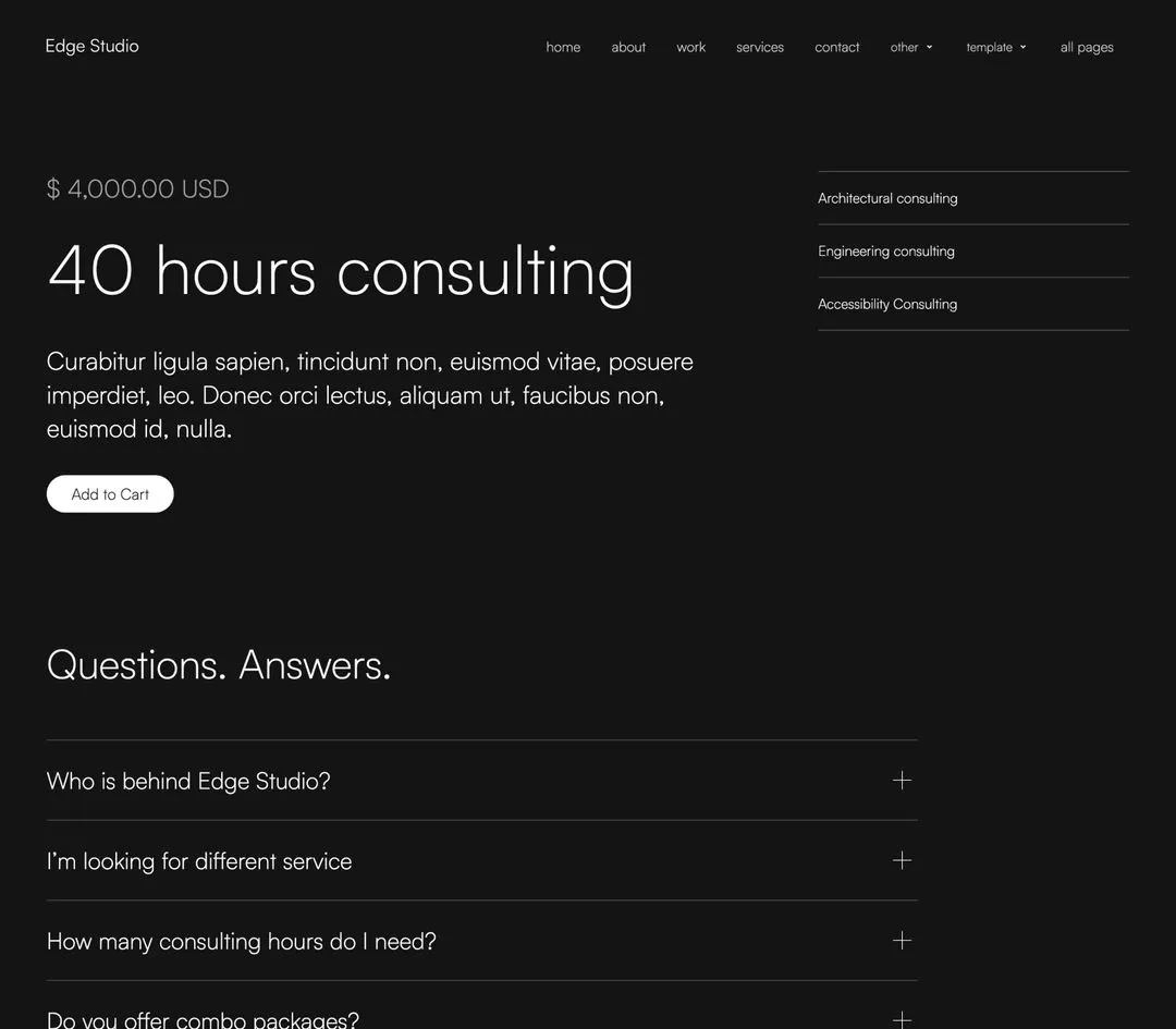 Edge Studio Architecture Webflow Template comes with eCommerce set up, so you can start selling your services straight away.